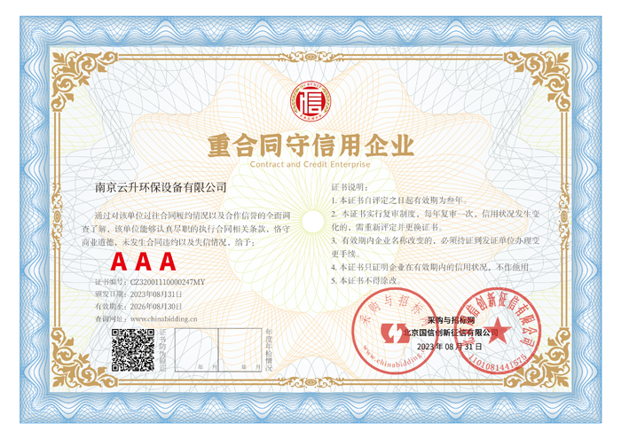 南京云升環(huán)保設備有限公司全體員工愿以環(huán)境保護為己任,以市場為導向,以優(yōu)質服務為原則,嚴格的管理、先進的生產(chǎn)工藝、至上的品質、完善的售前售后服務,與廣大新老用戶攜手并進,共鑄輝煌。公司已通過ISO9001:2000質量管理體系標準認證,成為江蘇省高新企業(yè),并進行不斷的技術改進和創(chuàng)新,為客戶和合作伙伴提供滿意的產(chǎn)品。