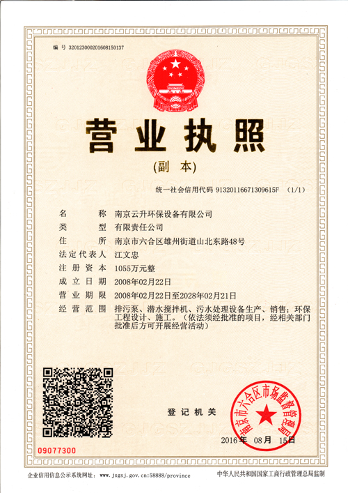 專業(yè)的各類水處理工程、水處理專用設備及泵類產(chǎn)品生產(chǎn)服務商南京云升環(huán)保設備有限公司占地面積二萬三千五百平方米,建筑面積約七千八百平方米,現(xiàn)有員工195名,各類工程技術人員41人,其中中高級以上22人,企業(yè)擁有各類大型專用機械72臺套,其中試驗臺3套,動靜平衡機4臺,各類機床28臺,CNC數(shù)控車床4臺,各類焊接設備19臺,各類起吊設備8臺套,交通、運輸工具8輛,為產(chǎn)品開發(fā)、生產(chǎn)制造、質量控制、快速服務提供了強有力的保障。南京云升環(huán)保設備有限公司全體員工愿以環(huán)境保護為己任,以市場為導向,以優(yōu)質服務為原則,嚴格的管理、先進的生產(chǎn)工藝、至上的品質、完善的售前售后服務,與廣大新老用戶攜手并進,共鑄輝煌。